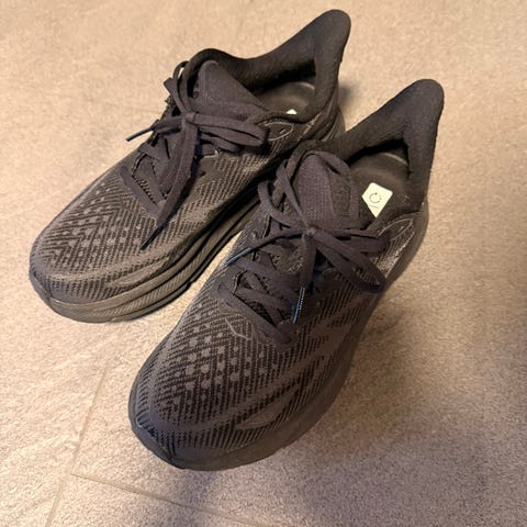 Hoka joggesko i størrelse 46. Skoene er i en mørk, hovedsakelig svart farge med innslag av grå og blå detaljer. Overdelen ser ut til å være i pustende tekstil/mesh med syntetiske forsterkninger. Yttersålen har kraftig mønster med integrerte pigger/spiker for bedre grep på glatt eller ujevnt underlag. Egner seg til løping eller gange utendørs der det er behov for ekstra feste, for eksempel på vinterføre eller på stier.