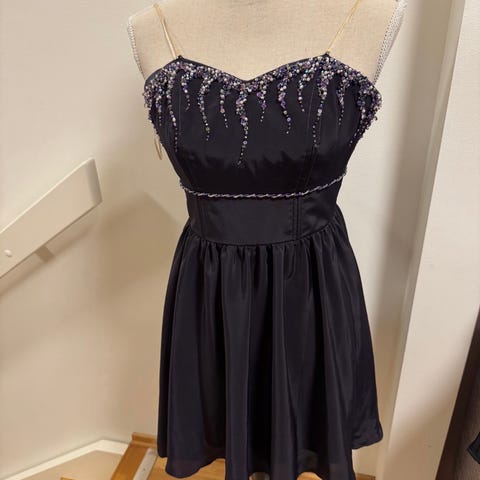 Skreddersydd kjole fra Filippinene. Lys lilla kjole med håndbroderte perler. En skulderstropp og knytting i rygg.