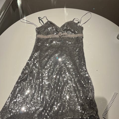 Ubrukt kjole fra Zara. Den har ingen bruksmerker, men er et parti på baksiden hvor det ser ut til å være en produksjonsfeil/mer sølv enn resten av kjolen.