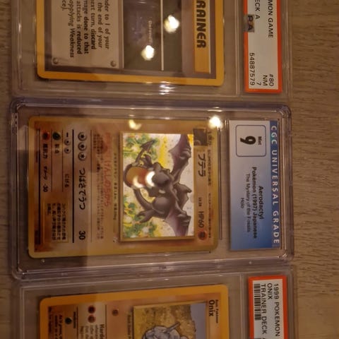 Jeg selges mine graderte kort. Det er onix, aerodactyl og defender. Onix og defender er ifra Trainer deck A og aerodactyl er fra pocketmonster og er japansk. Onix ligger ute for over 3000 på ebay i samme stand.