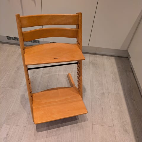 Stokke Tripp Trapp høy barnestol i hvitmalt tre. Stolen har justerbar sitteplate og fotbrett som kan tilpasses barnets høyde ved å flytte platene i sporene på sidene. Designet gjør at barnet kan sitte ved bordet sammen med resten av familien. Egnet som barnestol over flere år, fra småbarnsalder og oppover, avhengig av tilbehør og montering. Klassisk Tripp Trapp-konstruksjon med stabil ramme og tverrstag under for ekstra støtte.
