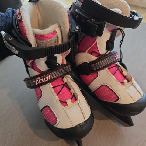 Frost barneskøyter justerbar str 32–35 på innersiden. Skøytene har yttermateriale i syntetiske materialer og tekstil, med polstret og myk innside for økt komfort. Fargekombinasjon rosa, hvit og svart. Lukkes med spenner og borrelås for enkel tilpasning. Egnet til generell skøytebruk for barn.
