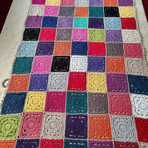 Heklet, ubrukt teppe i ullgarn. Teppet består av 54 bestemor-ruter som er sydd sammen, og heklet en omgang rundt hele teppet ytterst.