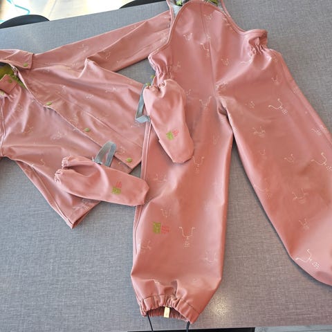 Regntøy i din stand. En skrape bak på venstre arm. Ikke hull gjennom. Ellers hel og pen. Mulig noe misfarget i bukse. Men hel