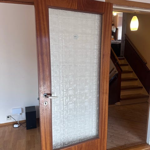 Selger en autentisk og sjelden pocket skyvedør fra ca. 1960-tallet, komplett med karm/rammeverk for innbygging. Dette er en flott mulighet for deg som ønsker å bevare den originale retro-stilen i hjemmet ditt.