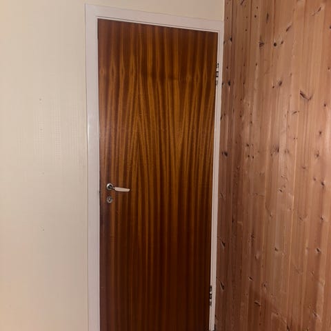 Døren har den karakteristiske, høyglansede overflaten i teakfinér og er av den typen som glir helt inn i veggen.