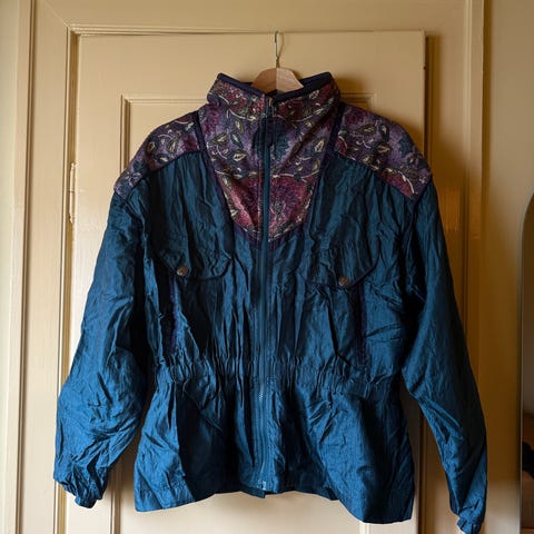 Dette er en flott jakke med svart grunnfarge med roser dekorert over hele. Ribbestrikk ved handledd. Glidelås på g hemper for lukking. Store sidelommer. Kan strammen nederst på begge sider . Meget varm .