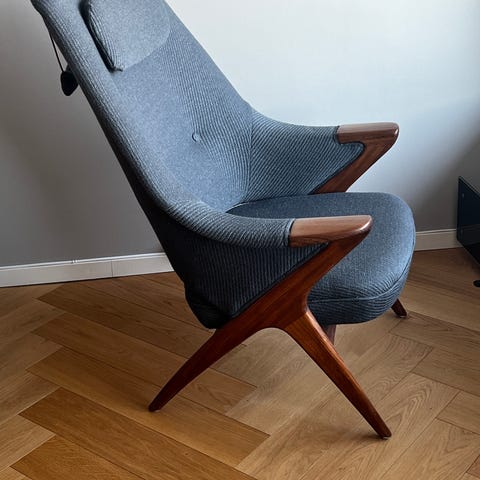 Denne klassiske sofaen er produsert av Møbel-Fiske i Øvre Surnadal i 1960-åra. Møbelfabrikk drevet av Erik Fiske. Jeg kjøpte den uten bein, og har brukt den i årevis med tilpassede IKEA-bein. Planen har vært å finne originalen, og få scannet og lagd kopier, men jeg har først nylig funnet designet, og nå har jeg ikke plass lenger. Jeg kan nok få formidlet mål av originalbein for skanning / kopiering om ønskelig (se bilde). De fleste knappene i putene er også borte, men kan enkelt erstattes. Prisen kan diskuteres. Jeg kan levere i Osloregionen mot tillegg.