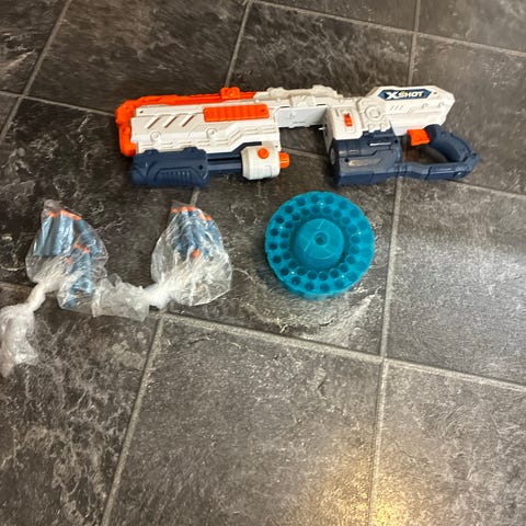 Nerf lekegevær i plast i blå og oransje farger. Modellen har magasinformet dartbeholder og skulderstøtte bak. Passer til lek med skumprosjektiler (darts) utendørs eller innendørs der det er god plass. Egner seg for barn som liker actionpreget rollelek med Nerf-utstyr.