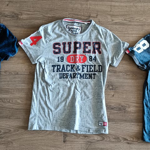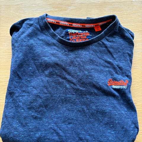 Superdry t-skjorte for herre i størrelse L. 5 stk T-skjorter. en grå, en mørkeblå og tre stk i ulike blåfarger. Alle i bomull. 4 stk har rund hals og liten Superdry-logo på brystet. En med v-hals.
