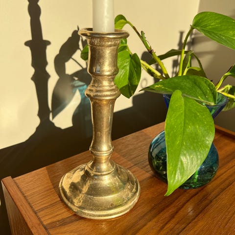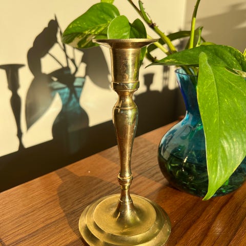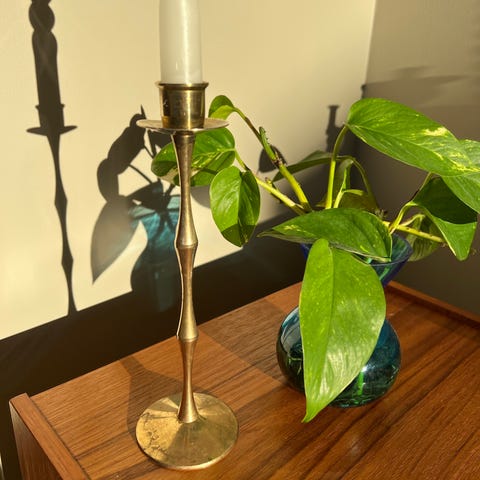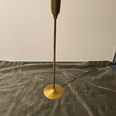 Selger en vegghengt lysestake i messing. Naturlig patina og bruksmerker kan forekomme. Er noe skjev, selges derfor billig. H14cm, D13,5cm.