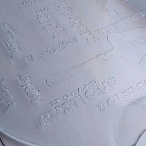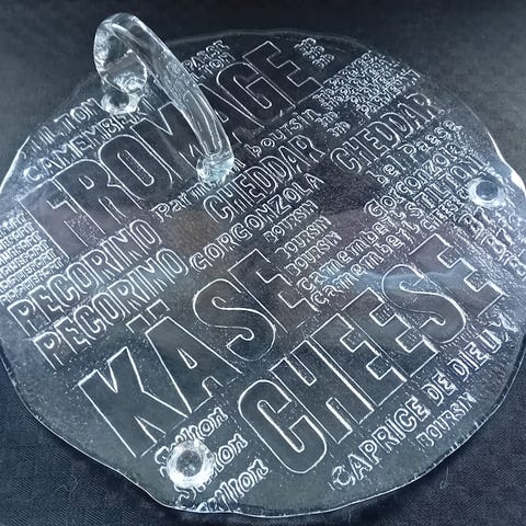 Ostefat i rundt glass med trykk av ordet «ost» på flere språk. NB! Lyse lager skygge på skriften slik at den kommer dobbel. Det er enkle ord.