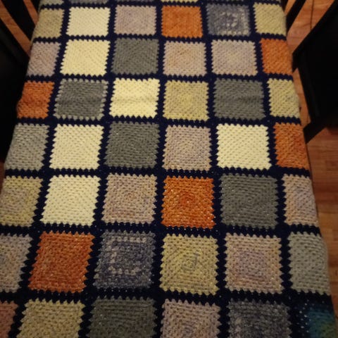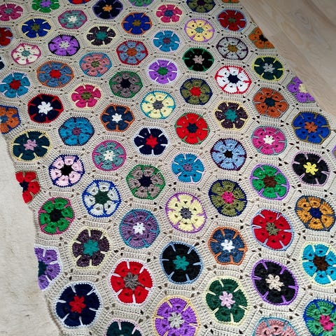 Heklet, ubrukt teppe i ullgarn. Teppet består av 54 bestemor-ruter, 6 av hver sort. Rutene er sydd sammen, og det er heklet en omgang rundt hele teppet ytterst.