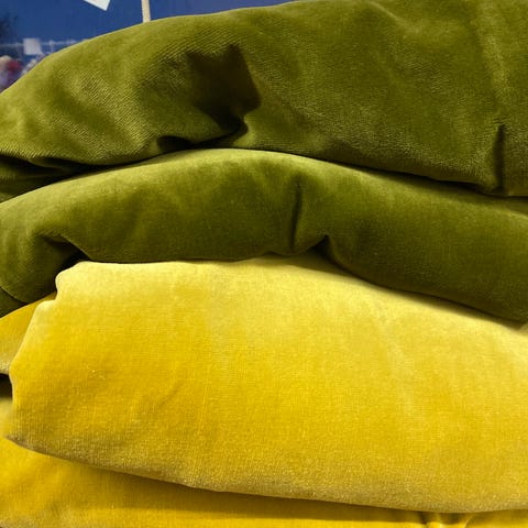 Beige farge, tykt stoff med sort bakside (lystett)