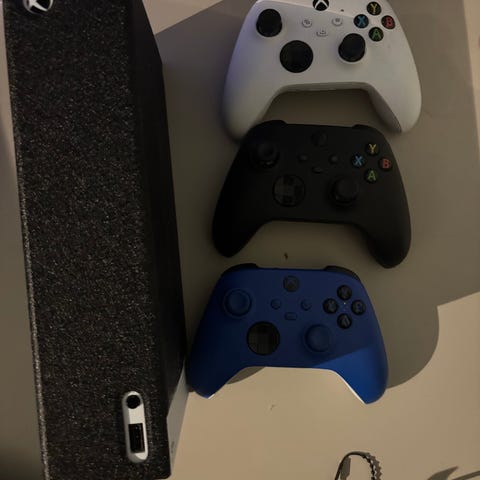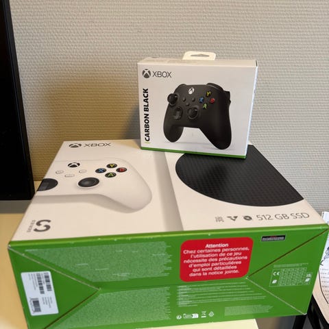 Microsoft Xbox Series S spillkonsoll i hvit farge. Kjøpt sommeren 2024, ble ikke brukt like mye som jeg hadde trodd. Pent brukt, unntatt et skrapemerke på selve konsollen.
