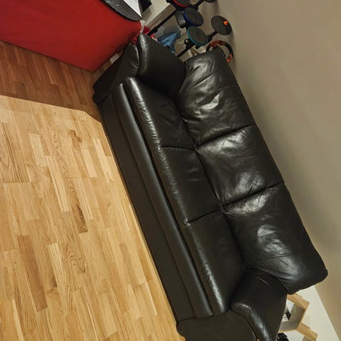 Pen eldre skinnsofa selgast billig.