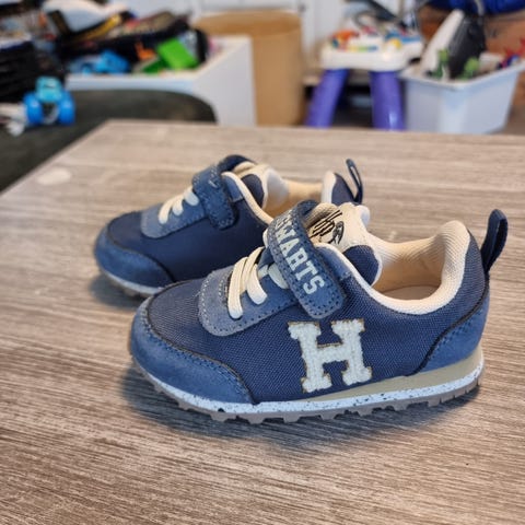 Fine, blå joggesko fra Hummel størrelse 19. Vi opplever Hummel Actus som veldig gode på foten, og har kjøpt til begge barna i alle flere størrelser.