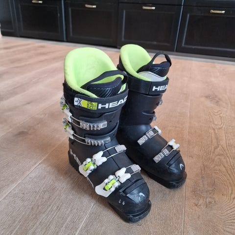 Head alpinstøvler i størrelse 25.0/25.5 MP. Støvlene er hvite med flere spenner for justering av passform. Passer til bruk i alpinbakke med vanlige alpinbindinger.
