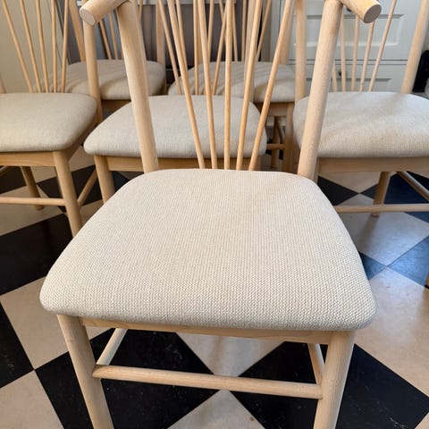 8 helt herlige danske spisestuestoler selges. Utført i bøk. Kommer ferdig renovert med ny stopping og valgfritt trekk i setet. Man kan velge skinn i ønsket farge, samt alle ullstoffene til Gudbrandsdalens Uldvarefabrikl (GU.no).