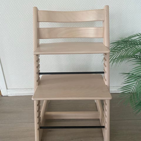 Stokke Tripp Trapp høy barnestol hvit farge med justerbart sete og fotbrett. Stolen har som tilbehør avtakbart spisebrett i hvit , bøyle og rygg i grå farge med sikkerhetssele. Egnet som spise- og sitteplass for små barn ved bordet. Nøytral farge som passer inn i de fleste interiører.