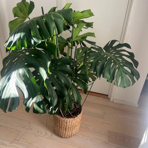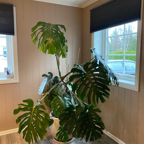Monstera deliciosa potteplante med store, grønne blader. Planten har karakteristiske innskjæringer i bladene og egner seg som inneplante i stue, kontor eller andre oppholdsrom. Trives best i indirekte lys og med jevn vanning uten å bli stående i vann.