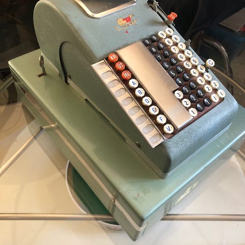 Gammelt kasseapparat, med runde taster, og gammel papirrull. Må hentes.