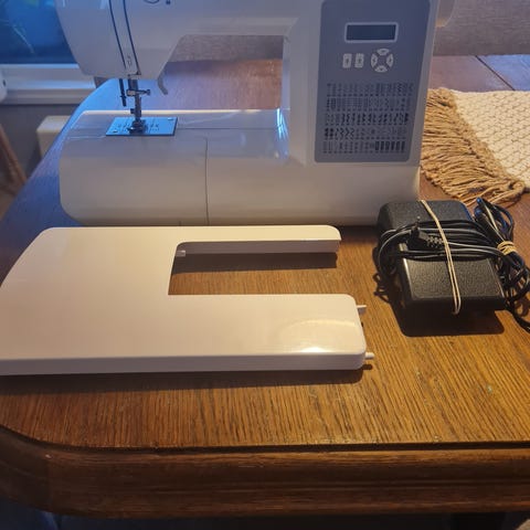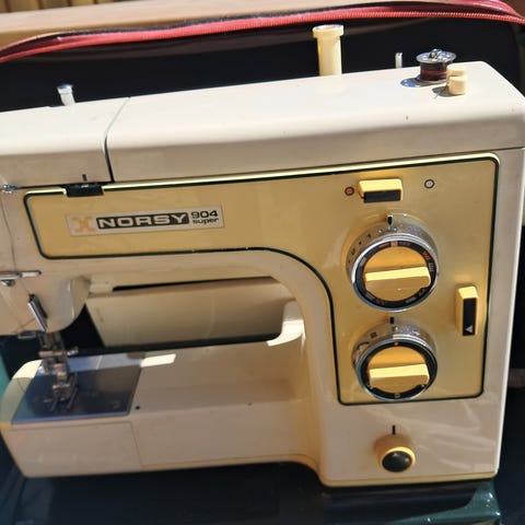 Singer symaskin med bord i tre. Maskinen er elektrisk og står montert i et bord/trekasse med utfellbar plate som gir større arbeidsflate. Fotpedal følger med og er koblet til maskinen. Passer til vanlig sømarbeid og reparasjoner i hjemmet. Modellnummer og eksakte spesifikasjoner er ikke oppgitt på bildene.
