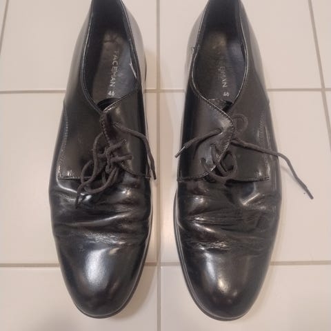 Face Man pensko i størrelse 42. Klassiske svarte snøresko med lav hæl. Egnet som formelle sko til dress eller penere antrekk. Basert på bildene fremstår de som laget i glatt materiale med lisser og skinn- eller skinnimitert såle. Passer til bruk ved høytidelige anledninger, jobb eller andre situasjoner der pene sko er ønsket.