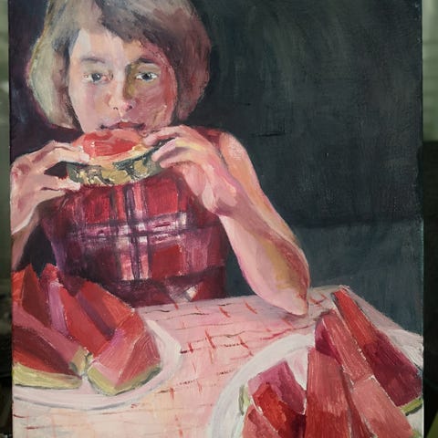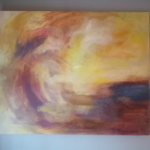Maleri på lerret av Viktoria Jensen Tsyrlinskaya. Motivet viser en mørk panter i et fargerikt, naturpreget landskap, med en kvinneskikkelse i forgrunnen og en figur i bakgrunnen. Fargebruken er kraftig og domineres av grønne, røde, gule og blå toner. Bildet er rektangulært og montert på blindramme, klart til oppheng på vegg. Passer som veggdekor i for eksempel stue, soverom eller arbeidsrom. Mål er 81x100 cm.