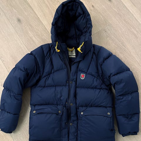 Fjällräven Expedition dun vinterjakke for herre i størrelse S. Jakken er blå og fylt med dun for god isolasjon. Modellen har hette, gjennomgående glidelås foran og flere frontlommer med klaff. Egnet som varm ytterjakke i kaldt vintervær.