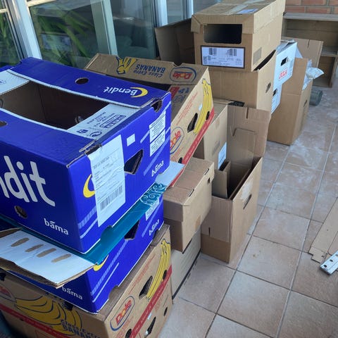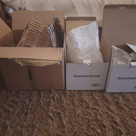 Papp flytteesker i brun farge. Eskene er sammenbrettet. Egnet til flytting, oppbevaring eller pakking av ulike gjenstander.