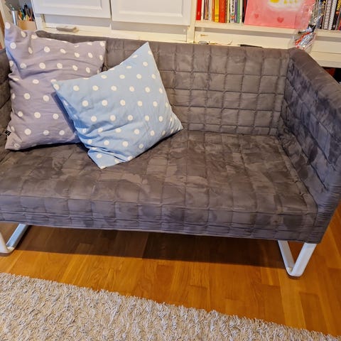 Ny uåpnet Knopparp sofa med to trekk selges. Trekkene er grå og gul som vist på bildet