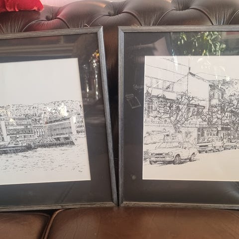 Grafisk trykk med gatemotiv i sort‑hvitt, signert og nummerert 160/300. Motivet viser eldre trehusbebyggelse i en gate, tegnet med penn/blekk-lignende strek på lys bakgrunn med tydelig struktur i papiret. Bildet er innrammet i enkel treramme med glass. Egner seg som veggdekor i stue, gang eller kontor. Tittel: "Parti fra Storgaten i slutten av 1890-årene". Tegnet av Ove Slyngstad 1980. Størrelse med ramme ca. 33x45 cm