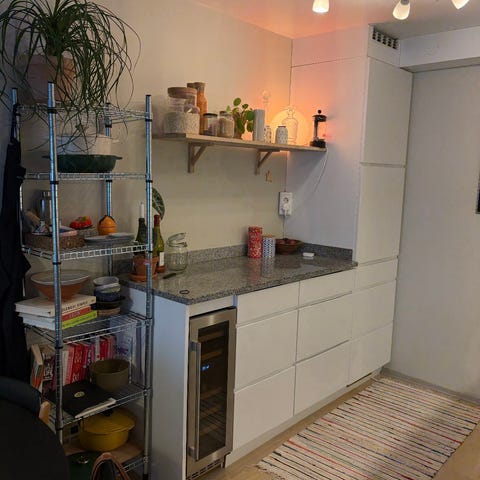 Unik omar-hylle fra IKEA med hjemmesnekret trevegg som passer perfekt til å henge stekepanner og kjeler + 2 knagger til diverse på andre side. Denne kan selvfølgelig også tas av.