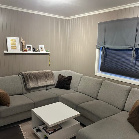 Gir bort godt brukt 15 år gammel sofa med sjeselong. Putene har glidelås og kan vaskes. Fast i putene og er god å sitte i. En av putene har en liten rift i en søm (se bilde).