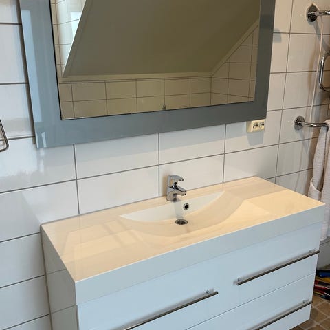 Selger er servantskap fra Linn Bad uten servant og kran. Skaper var limt på vegg i tillegg så øvre tverrstag er litt skadet, se bilde.
