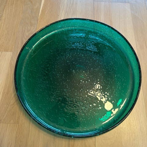 12 håndmalte, vakre, gamle frukttallerker søker ny eier. Tallerkene har flotte farger i lime, blått og hvitt. Kr 50,00 pr. stk. Selges helst samlet kr 550,00