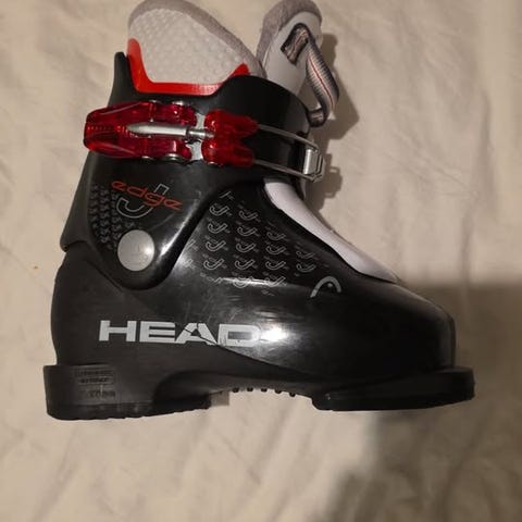 Head Edge alpinstøvler i størrelse 230 mm. Støvlene er i hovedsak svarte med røde og hvite detaljer. De har fire justerbare spenner i metall og plast for god tilpasning rundt fot og legg. Sålen er merket 230–235, og innerstøvelen er merket 230. Egner seg til bruk i alpinanlegg med standard alpinski-bindinger.