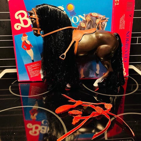 Hest med det utstyret som medfølger i pakken i tillegg til en ekstra dukke med klær som hører til settet 900kr