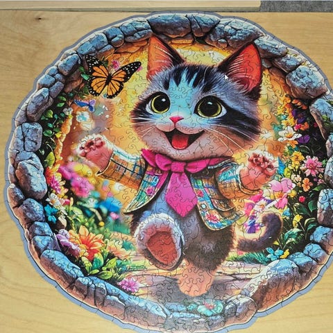 Zoom gjerne inn på bildet, så ser du brikkene, en del av disse med artige motiver. Noe helt annet enn de tradisjonelle puslespillene. Stort spekter av ulike brikketyper gjør disse litt ekstra kompliserte.