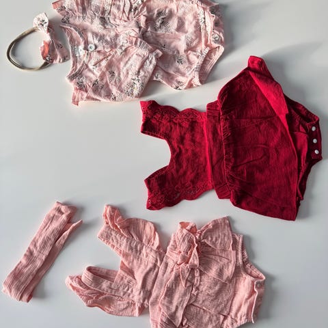 To sett fra POMPdeLUX. Mørke rosa/rød settet er i str 68 og det i lyserosa er i str 62. Lite og pent brukt. Ingen bruksmerker.