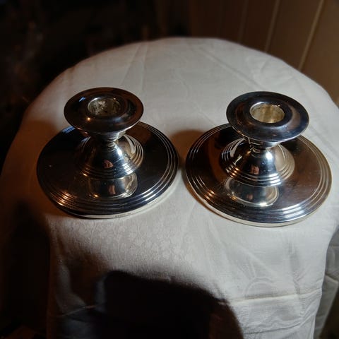 Kandelaber med to lysarmer + lysestake i samme sølvmønster, begge stemplet 830s. Meget pene og lite brukt - uten graveringer. Jeg har eid disse siden tidlig på 90-tallet.