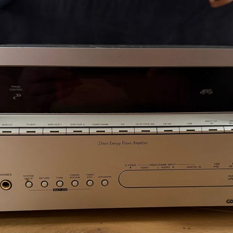 Fronten har volumkontroll, inngangsvelger og øvrige betjeningsknapper, mens toppen har ventilasjonsåpninger for kjøling av elektronikken.