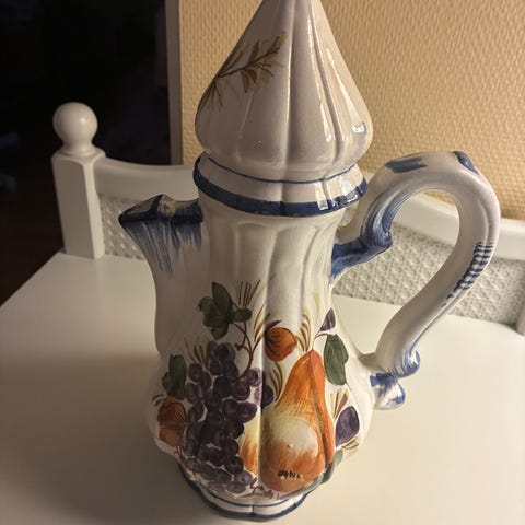 Tekanne i keramikk med håndtak og lokk. Brukt som pyntegjenstand. Vet ikke hva slags merke dette er, er ikke noe stempel.