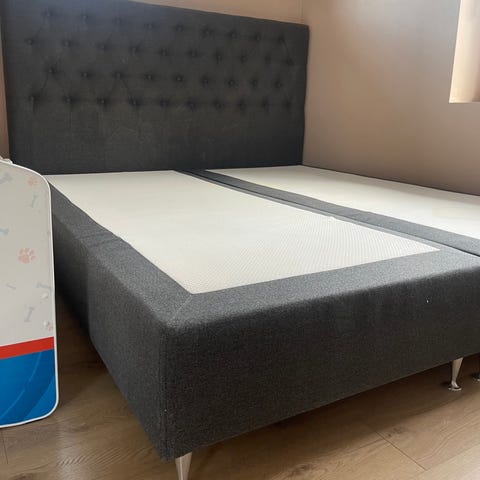 Madrassene har synlige bruksmerker, som vist på bildene. Innfestningene i enden av sengerammen er slitt, men rammen bør være mulig å ta fra hverandre og settes sammen igjen.