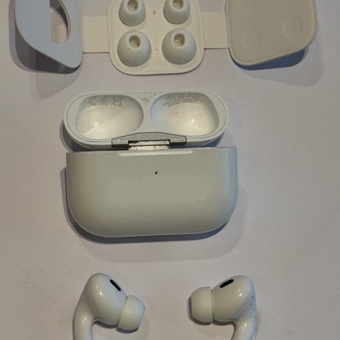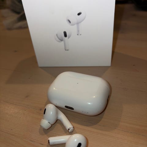 Apple AirPods Pro trådløse ørepropper i hvit farge. Gen 2. Funker fortsatt fint - men har gått over til de med USB-C av praktiske hensyn :)