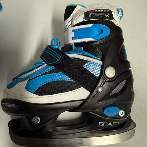 Thinsulate Adjustable Ice Skate, hockeyskøyte for barn. Størrelse 31-34. Pent brukt, normal slitasje. Alt fungerer som det skal. Enkelt å justere størrelse ved å trykke og holde inne på lilla «push» knapp samtidig mens man drar ut. Gode anmeldelser og høy score på xxl. Nypris: 559 kr.