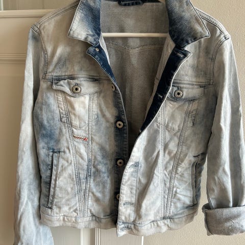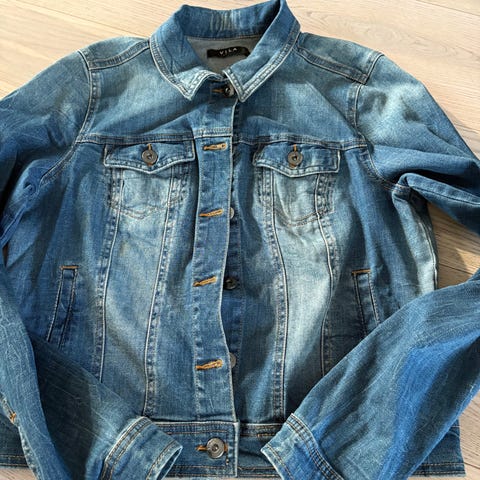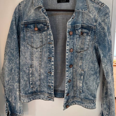 Vila olajakke i denim for dame i størrelse M. Jakken er i blå denim med vasket uttrykk. Klassisk olajakkemodell med krage, knappelukking foran og brystlommer med klaff og knapp. Sidelommer i front. Materiale i denim (bomull). Jakken har slitte partier og rifter enkelte steder, som gir et brukt og røft preg (kjøpt slik). Passer som ytterlag over ulike antrekk i hverdagen.