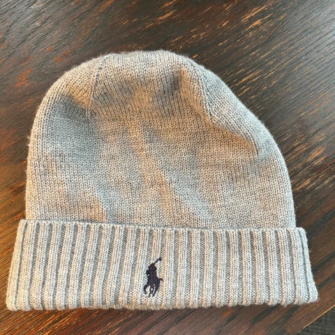 Ralph Lauren Polo lue i mørkblå farge. Luen er strikket i merinoull og kommer i størrelse one size for herre. Klassisk modell med oppbrett og brodert logo foran. Egnet til bruk på kalde dager og passer til hverdagsbruk og utendørsaktiviteter. Ikke brukt, fordi den ikke passer i størrelse. Fikk den i gave til jul 2025