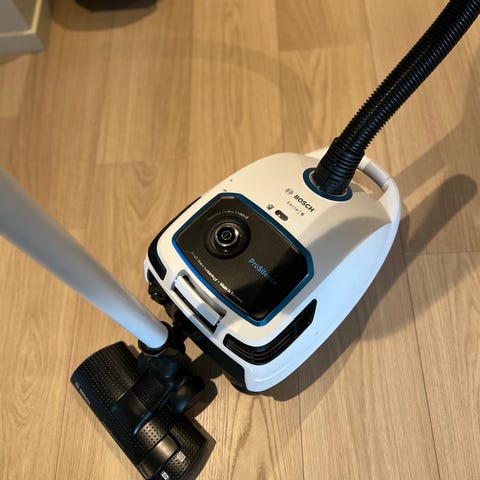 Bosch Athlet trådløs støvsuger i hvit farge. Støvsugeren er en skaftmodell uten pose, med integrert støvbeholder. Den drives av oppladbart batteri og leveres med lader som vist på bildet. På skaftet er det regulering av sugestyrke og indikator for batteritid opptil 60 minutter. Egnet til rengjøring av gulv og tepper i hjemmet.